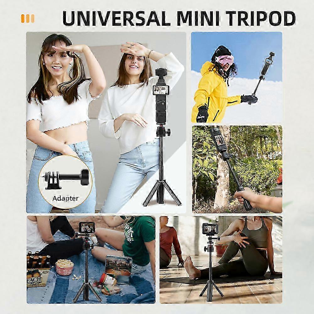 Camera Universally Selfie Stick Tripod For GoPro/DJI Action/Pocket/Insta 360 Feature: 1.Height adjustment range is 15.8-30.8cm(6.22-12.12in) 2.360 °Ratation Ball Head Design,Provides more shooting angles 3.The side of the tripod have a cold shoe is convenient to attached the LED video light or microphones. 4.This mount uses a more stable triangular support and a non-slip bottom design for more stable shooting! Specification: Material: PC Applicable models:For GoPro/action/Insta 360/pocket Color: Black Net weight::3.38oz(102.7g) Package weight:4.69oz(134.2g) Product size:1.52*1.1*2.82in(4.86*3*15.8cm) Package size:1.85*1.37*7.32in(4.7*3.5*18.6cm) Package Includes: Selfie stick tripod*1 Sport camera adapter*1 Long screw*1 Note: 1.Does not include Sports camera, 2.Transition: 1cm=10mm=0.39inch, 3.Please allow 1-3mm error due to manual measurement. please make sure you do not mind before ordering, 4.Due to the difference between different monitors, the picture may not reflect the actual color of the item,please make sure you do not mind before ordering, Thank you! Note: Due to the light and screen setting difference, the item's color may be slightly different from the pictures. Please allow slight dimension difference due to different manual measurement. Sold by-YJL official store