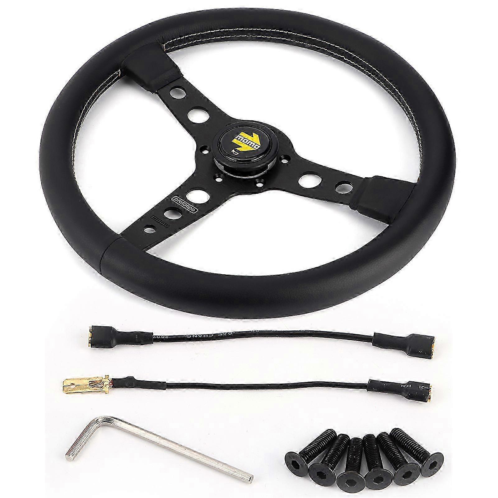 25-26 350mm/14in for MOMO Prototipo Style 6Bolt Black Leather Racing Steering Wheel Gray Stitching with Horn Button