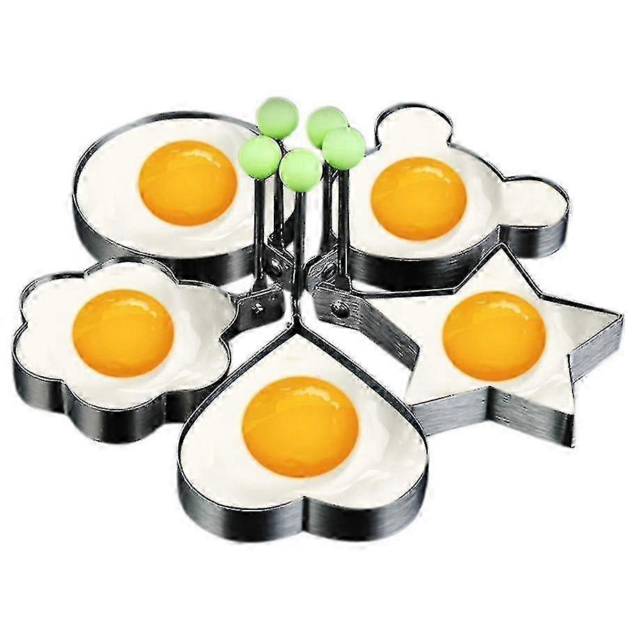 [Premium Food Grade Stainless Steel] The egg molds are made of food grade stainless steel material. It's odorless and nontoxic, easy to clean and enduring. High temperature resistance, corrosion resistance, no rust, sturdy and durable.[Humanized design]Handle is pulled to prevent and not hurt. The rotatable handle is easy to use and will not occupy the position after being used up[Multifunctional kitchen gadgets]You can make your food more crisp and juicy without mess. This egg mold ring pack perfect for families who want to make breakfast quickly and easily with eggs, pancakes, cookies, breakfast sandwiches, fritters, and even omelettes. Get the perfect fried egg It's also easy to POP-out of mould straight onto the plate in just a few minutes. Definitely a time saver [More Egg Molds Shapes]This makes them great for children who are very picky with the shape of their foods. Especially when you have several children, this 5 pieces set is a must have egg kitchen gadget [Hand washable and Dishwasher Safe]Once it gets dirty after you cook your food, This egg molder pancake maker can be washed by hand with little soap and water. Or you can just POP-it into the dishwasher for easier and quicker way. It will come as good as new without any damages.Great for cookies, omelets, hash browns and so much more Fast, easy and way to make perfect egg and pancakes every time You can throw your microwave egg poachers, egg poacher pans, electric egg poachers - this simple egg gadget is all you needFeatures:No stain, mold, mildew, or absorb odors.Makes multiple eggs and pancakes at the same time without the mess.Dishwasher Safe: Some stainless steel cooking moulds are not easy to clean, but not thisone.Tips- When you're using it, please spread blended oil first on the egg ring, which can avoid sticking tothe fired pan while create perfect shapes. It will also prolong the egg frying mold's life span and make it more durable.Color: GreenMaterial: stainless steelPackage Contents:5 * cooking moldsOnly the above package content, other products are not included.Note: Light and different displays may cause the color of the item in the picture a little different from the real thing. The measurement allowed error is +/- 1-3cm. Note: Due to the light and screen setting difference, the item's color may be slightly different from the pictures. Please allow slight dimension difference due to different manual measurement.
