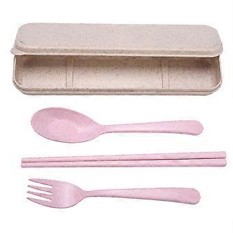 3 PCS Portable Wheat Straw Flatware Spoon Chopsticks Fork with Travel Case Pink