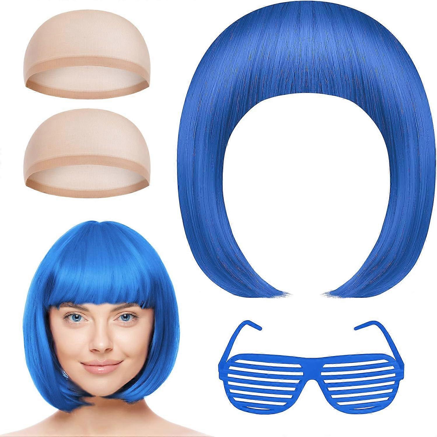4 Pack Short Blue Bob Wigs Set with Sunglass and Wig Cap, Neon Fancy Dress Accessory Cosplay Party Wig Red