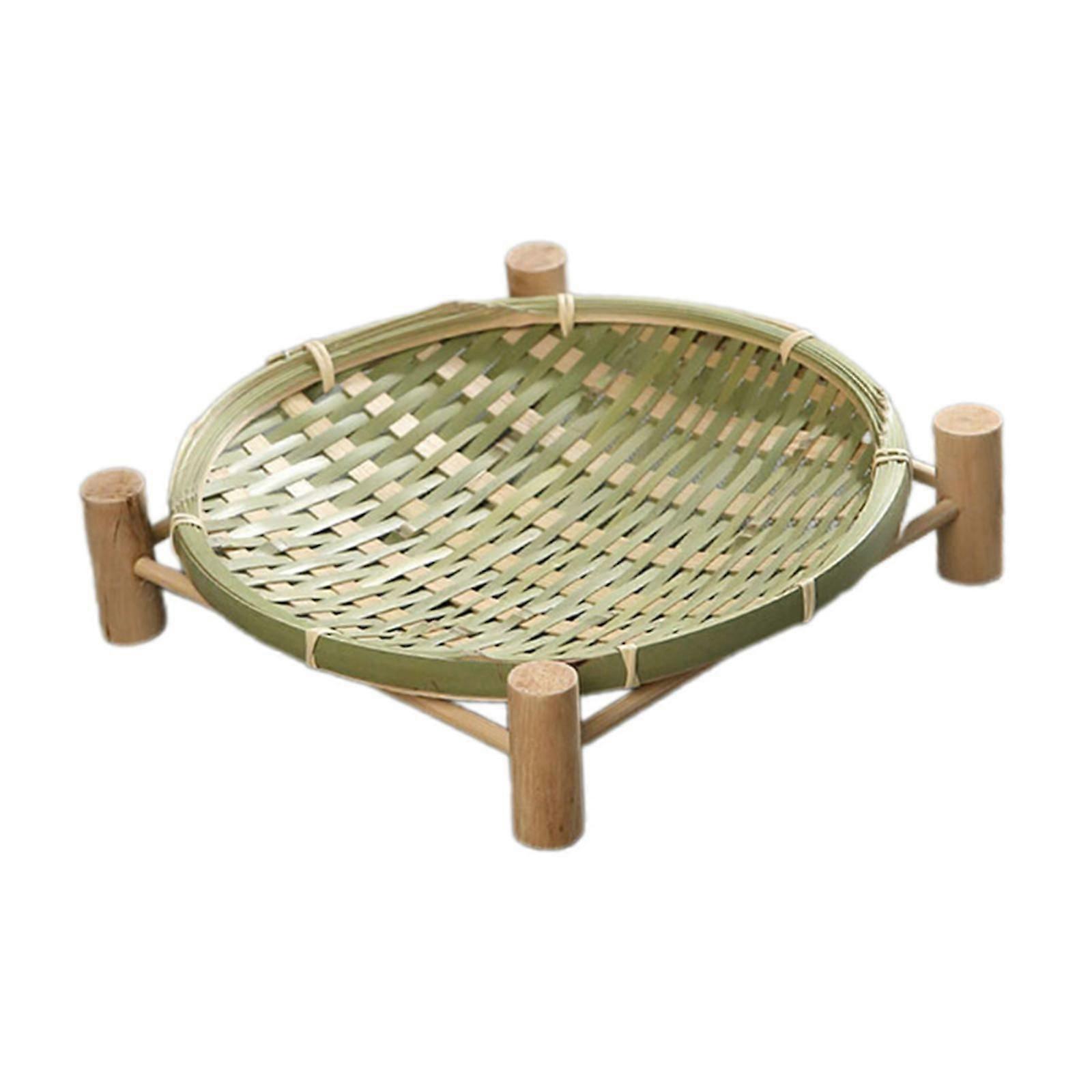 Bamboo Woven Basket Tray Round Storage Tray for Vegetables Breakfast Cabinet 22cm Green
