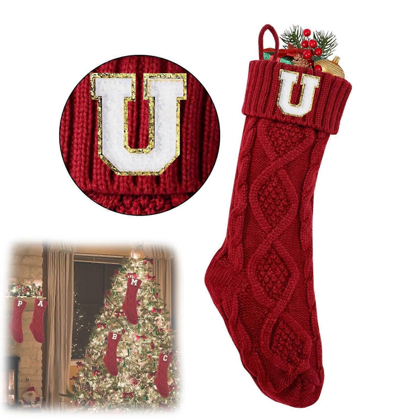 Christmas Stocking with Initial U, 18" Monogram Knitted Xmas Stocking, Red Fireplace Hanging Decoration for Family Party (1 Pack)