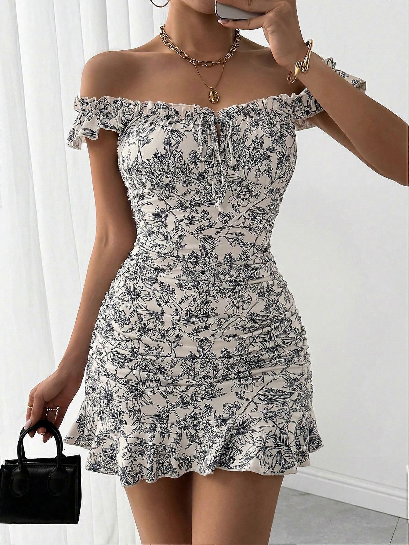 Women's Retro Style Floral Print Off Shoulder Ruched Hem Dress