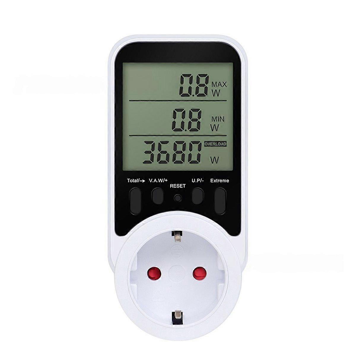 Safe and Chemical-Free: The Digital LCD Energy Meter contains no high-concern chemicals, ensuring it is safe for use in any home or professional environment. This feature is crucial for those who are health-conscious and prefer products that do not contribute to indoor pollution. Monitoring with Digital Display: Equipped with a digital-only display, this wattmeter provides precise readings of wattage, kWh, voltage, and current, helping you to monitor and analyze power consumption effectively. The clear LCD screen ensures easy reading and immediate access to data. Designed for DIY Electrical Projects: Whether you're a professional electrician or a DIY enthusiast, this energy meter is an essential tool. Description: The PMB06 power metering socket series is designed to monitor and measure the power consumption of household appliances, helping you manage and calculate electricity costs effectively. With a user-friendly interface, including a large LCD screen, this device displays real-time data such as power consumption, voltage, current, and more. It is equipped with a "RESET" button for easy troubleshooting, ensuring reliable performance. Features: Monitors and saves electricity by accurately measuring the power consumption of your devices. Large LCD screen for clear and easy reading of real-time data including voltage, current, and power consumption. Suitable for household and office appliances like refrigerators, air conditioners, and computers. Features an overload alarms that activates when the current exceeds 16A or power surpasses 3680W. Specifications: Voltage: 0V~9999V Current: 0.000A~65.00A Power: 0W~9999W Frequency: 0~9999Hz Power factor: 0.00~1.00 Electricity: 0.000KWH~9999KWH Unit price: 0.00~99.99 Electricity fee: 0.00~9999 Plug Type:EU Plug,it applies to Indonesia, Germany, France, Spain, Italy and so on. Voltage: AC230V Color: White Material: plastic Package Contents: 1* Digital LCD Energy Meter (No Backlight) Only the above package content, other products are not included. Note: Light reflection and different displays may cause the color of the item in the picture a little different from the real thing. The measurement allowed error is +/- 1-3cm.