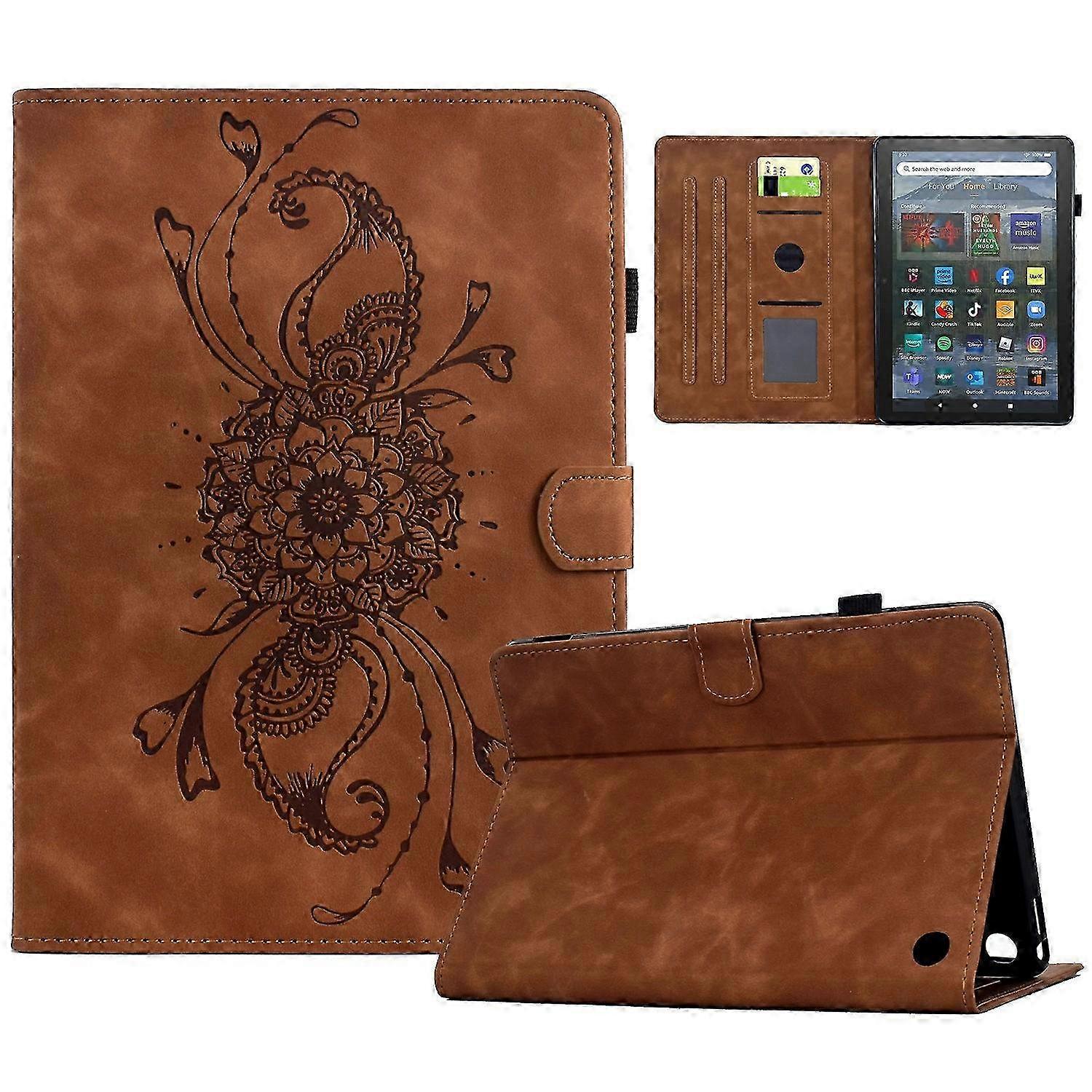 For Fire HD 8 (2022) (2020) Case Mandala Imprinted Leather Tablet Cover with Card Slots Brown