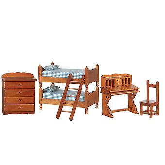 Dolls House Walnut Bedroom Furniture Set With Bunk Bed & Desk Miniature 1:12