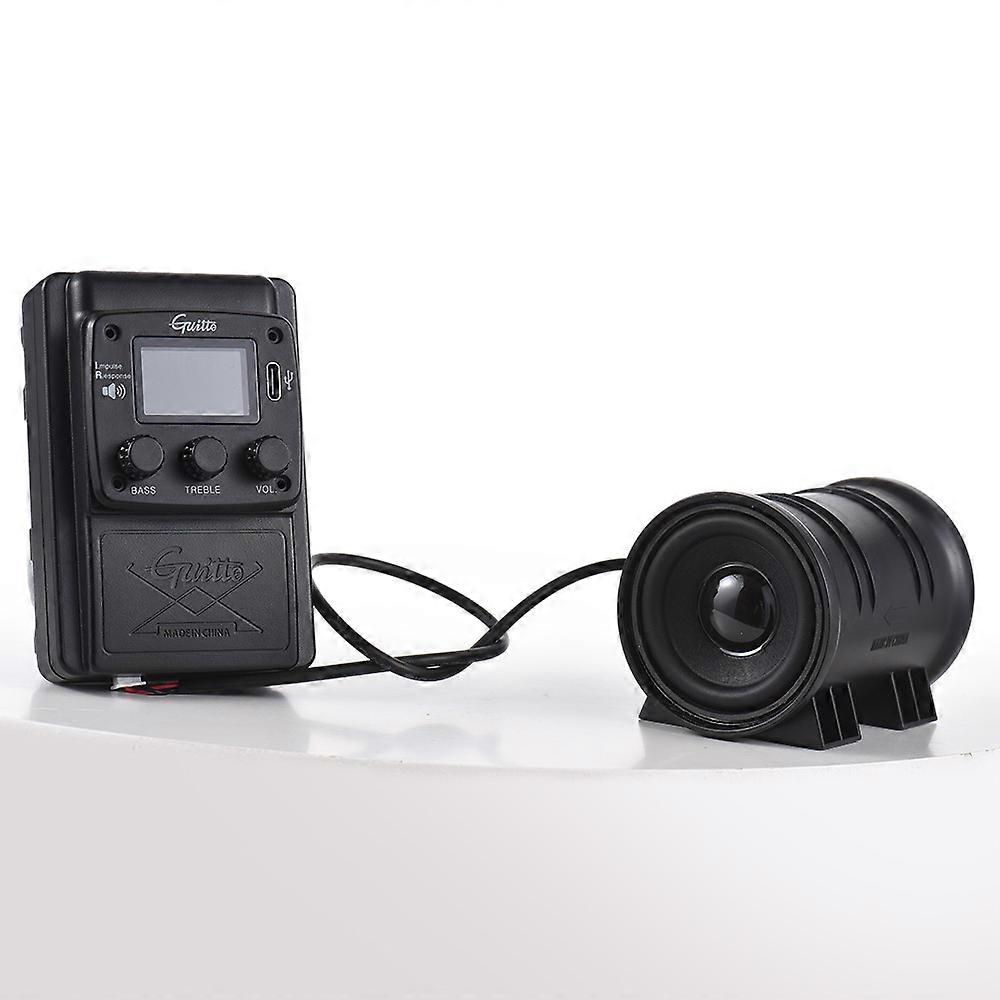 GUITTO GGP-04 Acoustic Guitar IR Vibration Pickup LCD Display Guitar Pickup with Multiple Classical Guitar IR Tones / Reverb Delay Effects / Precise Tuner Fit for 36-42in Classical and Acoustic Guitar Features: 【WAV Format】 The classical guitar pickup supports WAV format, ensuring high-quality audio playback and recording. With a 24-bit sampling precision, the device captures and reproduces audio with exceptional clarity and detail. And it features a 44.1KHz sampling rate, providing a standard and accurate representation of the audio signal. With a sampling length of 1024pts, the device captures a sufficient amount of audio data to accurately reproduce the original sound. 【Powerful 3W Output】 The guitar pickup with volume control boasts a powerful 3W output, delivering rich and immersive sound quality. The device comes with a built-in 3.7V 2900mAh lithium battery lithium battery, and requires a charging time of 4-5 hours, ensuring a long-lasting battery life for extended usage. 【2in 8ohm Speaker】 Equipped with a 2in 8ohm speaker, the guitar pickup produces clear and balanced sound output. 【LCD Display Screen】 The acoustic guitar pickup is equipped with an LCD display screen, providing clear and intuitive information about the device's settings and status. 【5 IR Effect Files】 The vibration pickup with a built-in reverb delay pickup, includes 5 IR effect files, including various body types such as Auditorium and Dreadnought, enhancing the versatility of the sound. The device offers multiple reverb and delay effects, including 1 chorus, 3 delay, and 3 reverb effects, allowing for creative sound customization. Specification: Product material: Plastic Unit size: 9.5 x 6.5 x 5.5cm / 3.74 x 2.56 x 2.17in Vibration amp size: 8 x 5.5 x 5.5cm / 3.15 x 2.17 x 2.17in Product weight: 155g / 5.47oz Application: Suitable for 36-42in classical & acoustic guitar Function: Digital effects, IR, tuner and vibration speakers Battery: 1*3.7V 2900mAh lithium battery lithium battery Knob: Bass (for Effect mode) - Treble (for Tuner mode) - Volume (for IR selection mode). Adjust the bass knob to control the Volume of Chorus, adjust the Treble knob to control the Volume of Delay, adjust the Vol. knob to control the Volume of Reverb IR file format: WAV Sampling accuracy: 24bit (supports 16/24/32 third party IR files) Sample rate: 44.1KHz Sampling length: 1024pts Max. power: 3W Charging time: 4-5h Speaker size: 2in Speaker impedance: 8ohm Packing List: 1 x Unit 1 x Pickup 1 x Type-C Cable 1 x Vibration Amp 1set x Accessories 1 x Tail Nail's Connecting Cable 1 x Paperboard 1 x Battery 1 x Manual