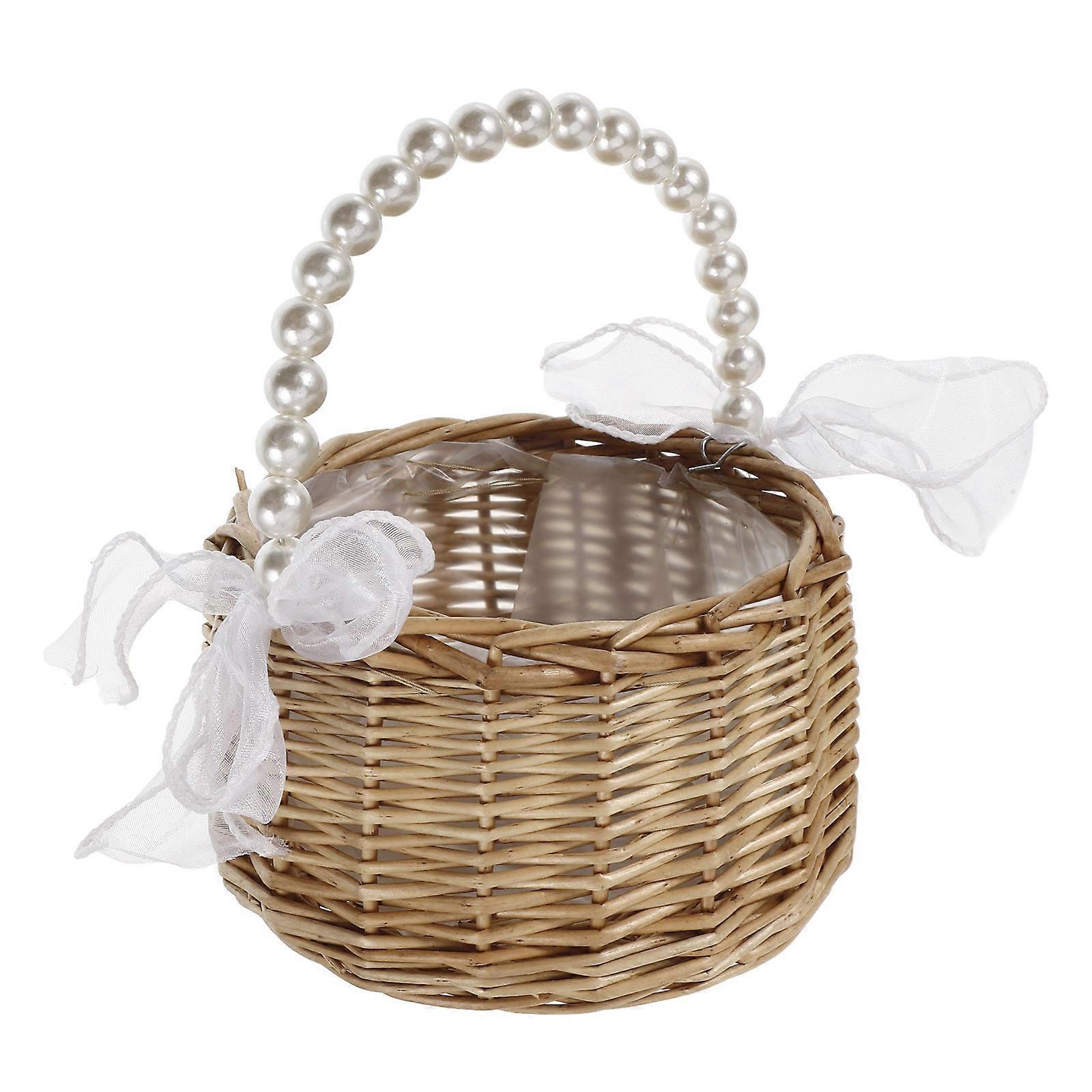 Light Brown Woven Handbag with Imitation Pearl Handle and Bow for Storage Lightweight and Versatile 10.5x4x12 inches