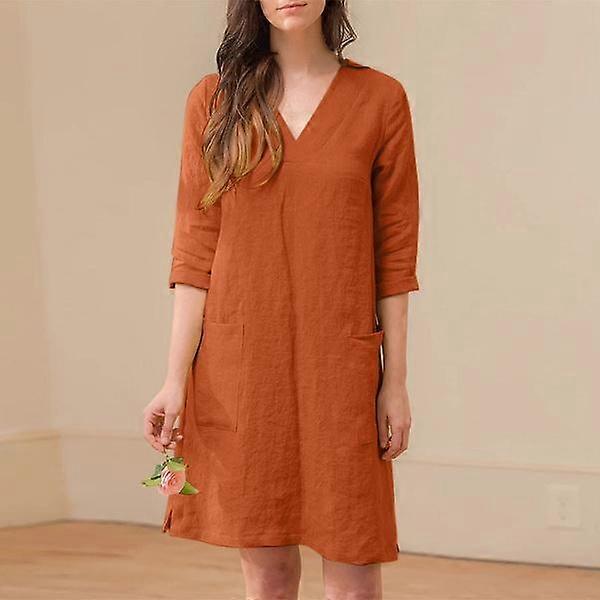 Loose V-neck Solid Colour Dress Women's Vintage Cotton Linen Half Sleeve Mini Dresses
