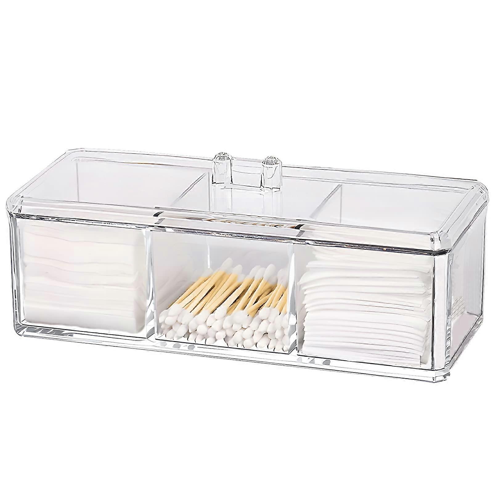 QTIP Cotton Ball Holder with Lid, Clear Acrylic Bathroom Organizer, 3 Compartments for Vanity Countertop Storage