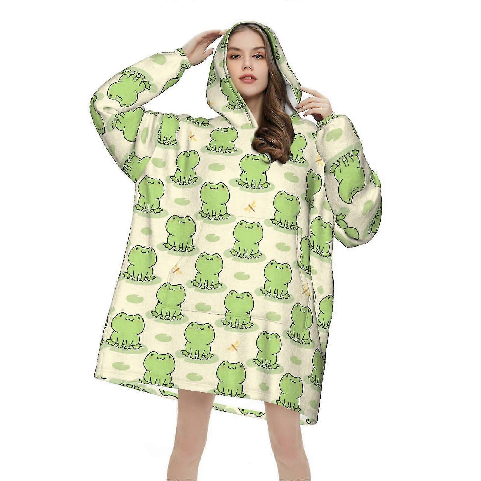 Cute Cartoon Frog Pattern Wearable Blanket Hoodie for Women Men Flannel Blankets Hooded Blanket