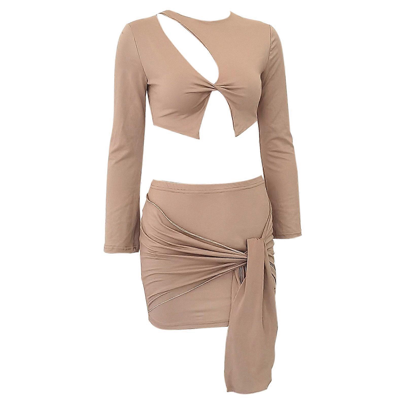 Stylish Women's 2 Piece Outfits Irregular Hollowed Out Long Sleeve Solid Color Crop Top and Mini Skirt Set Khaki S