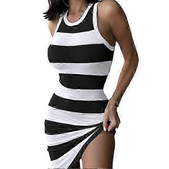 Stripe Print Mini Dress for Women - O-Neck Sleeveless Bodycon Sundress with Slim Fit & Stretchy Design for Summer Fashion