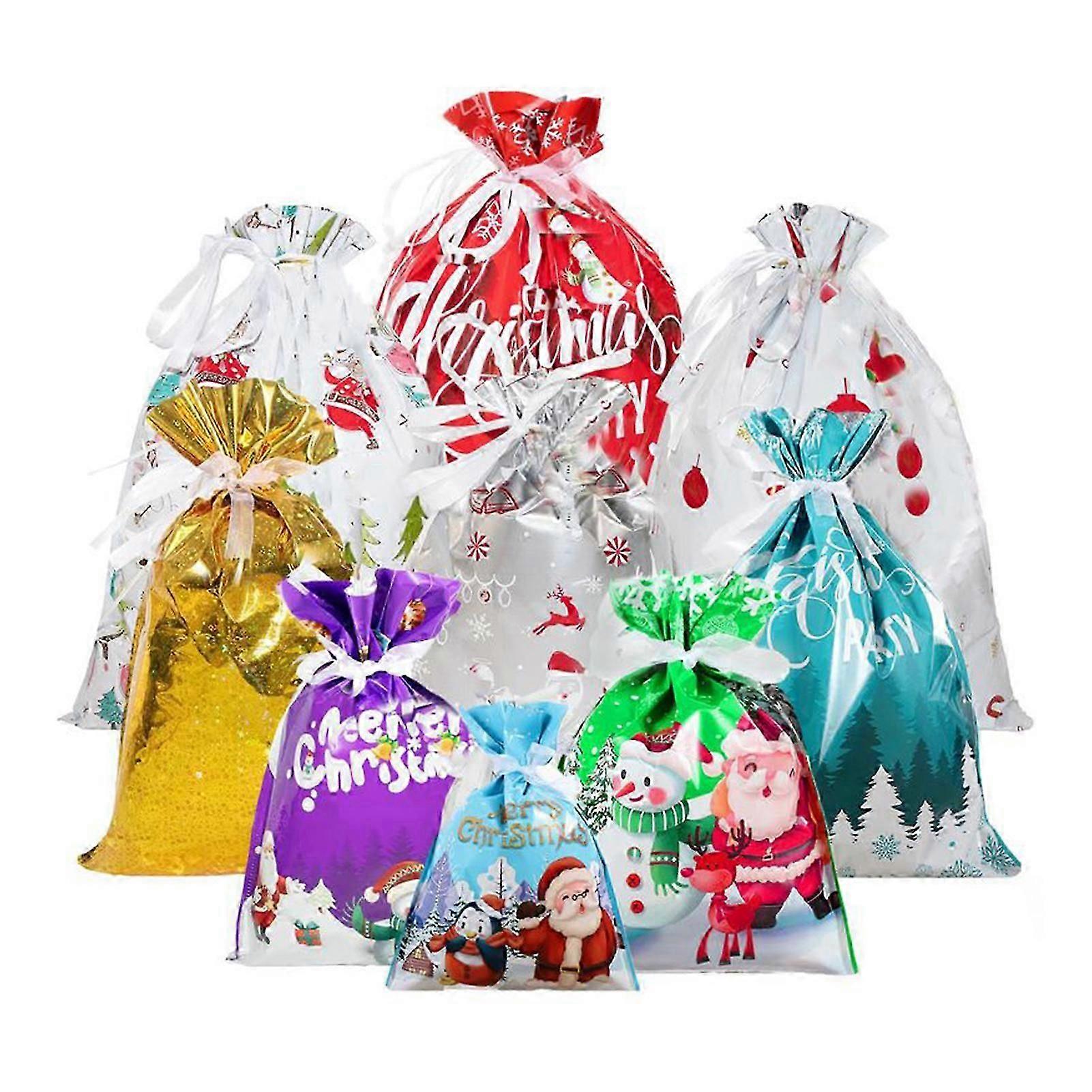 Holiday Christmas Drawstring Gift Bag Packaging Foil Wrapping Sacks for Xmas Presents & Party Favors in 3 Sizes, 9 Patterns