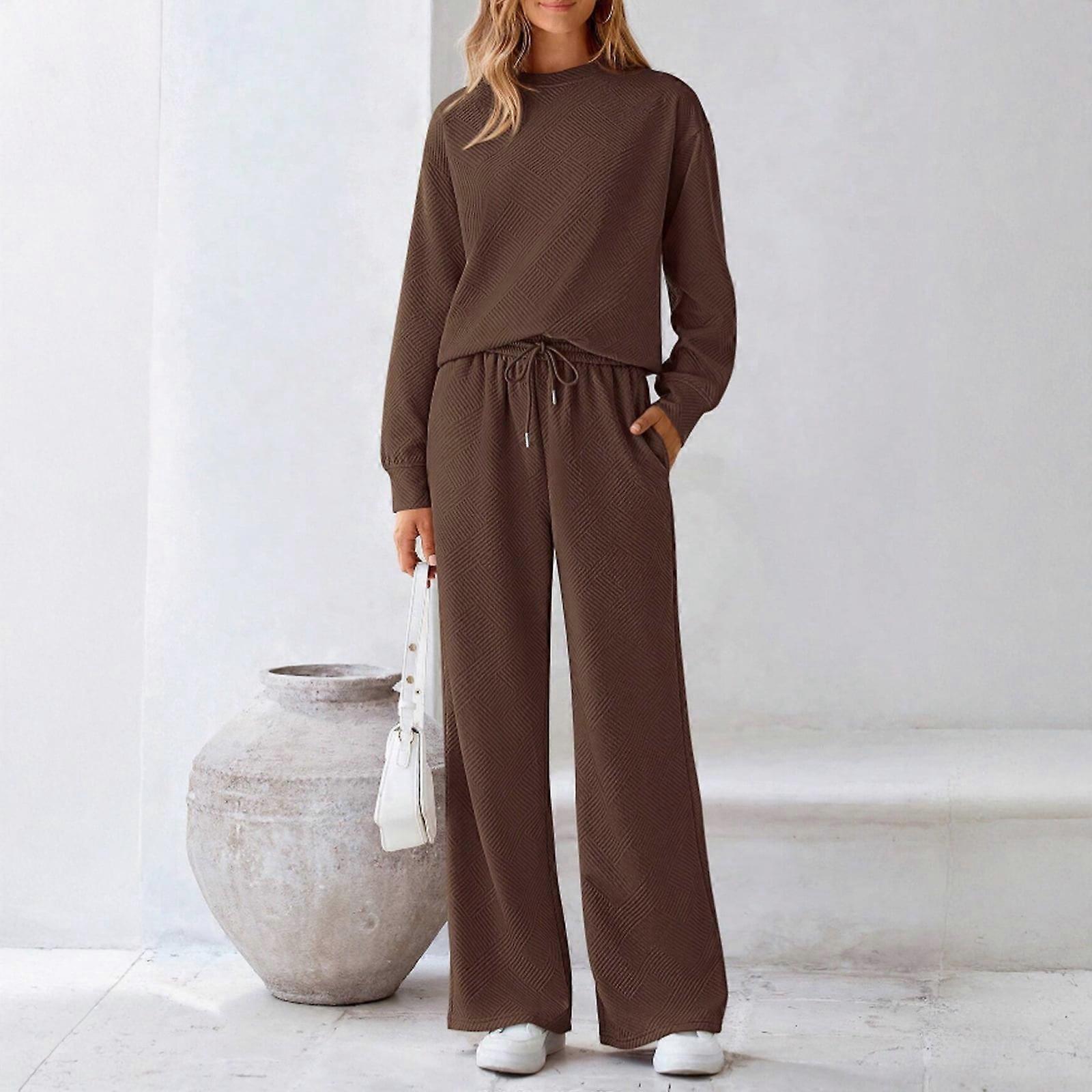 Women's Fall Solid Textured Drawstring 2-Piece Tracksuit Set Coffee L
