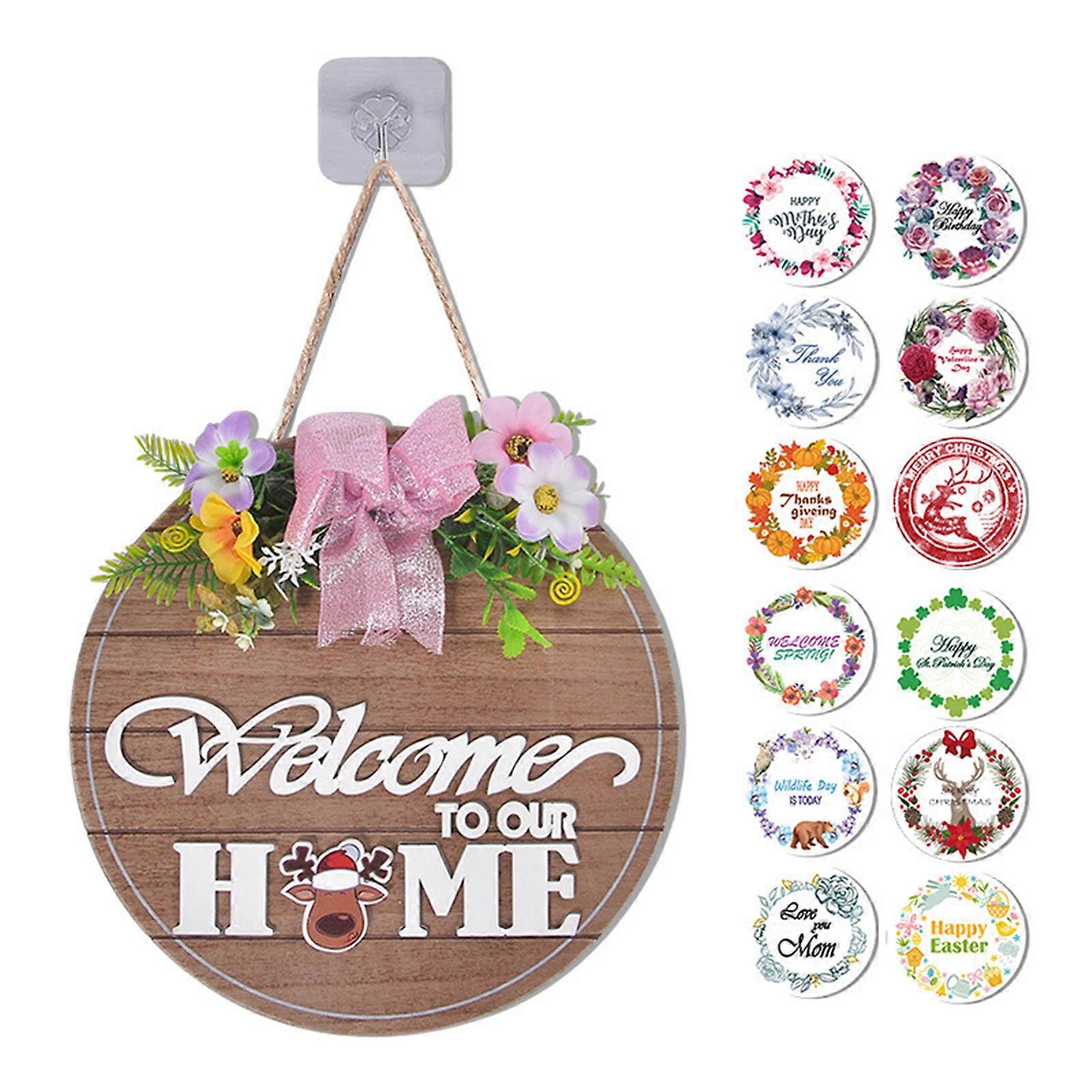 Interchangeable Wooden Sign Flower Wreath with 12 Holiday Pieces Easter Christmas Front Door Rustic Hanging Plaque Decor