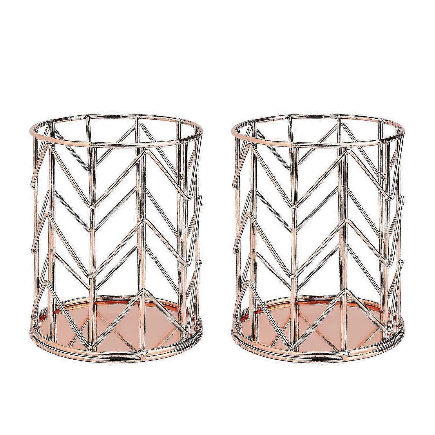 Set of 2 Rose Gold Round Iron Art Pen Holders - Stylish Pencil Stand for Desk Organization & Home Office Decor
