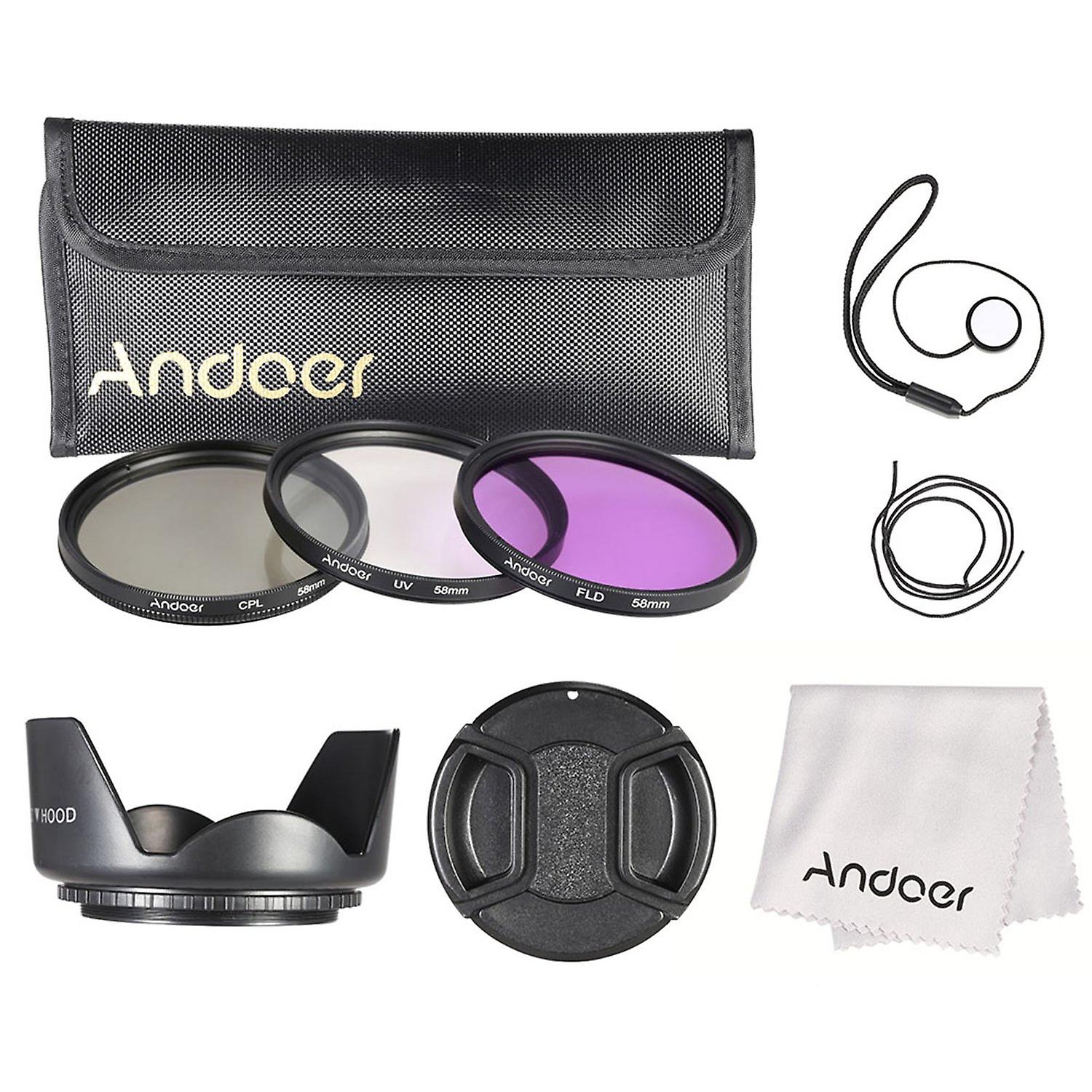 Andoer 58mm Filter Kit (UV+CPL+FLD) + Nylon Carry Pouch + Lens Cap + Lens Cap Holder + Lens Hood + L